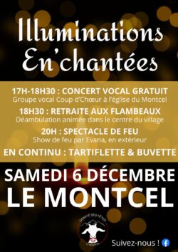 Le samedi 6 décembre à partir de 17 heures, joignez-vous à nous pour une soirée féerique dans l’église du Montcel, lors des » Illuminations En’chantées » organisé par le comité des fêtes.